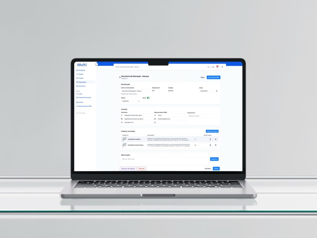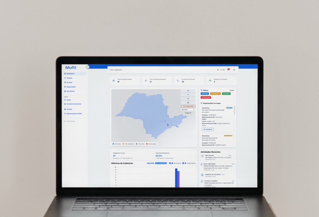 A missão era criar uma solução corporativa escalável e inteligente para gerenciar todo o fluxo de negociações e contratos do programa em território nacional — conectando representantes comerciais, secretarias de educação e a equipe administrativa por meio de uma plataforma moderna, segura e de alto desempenho.